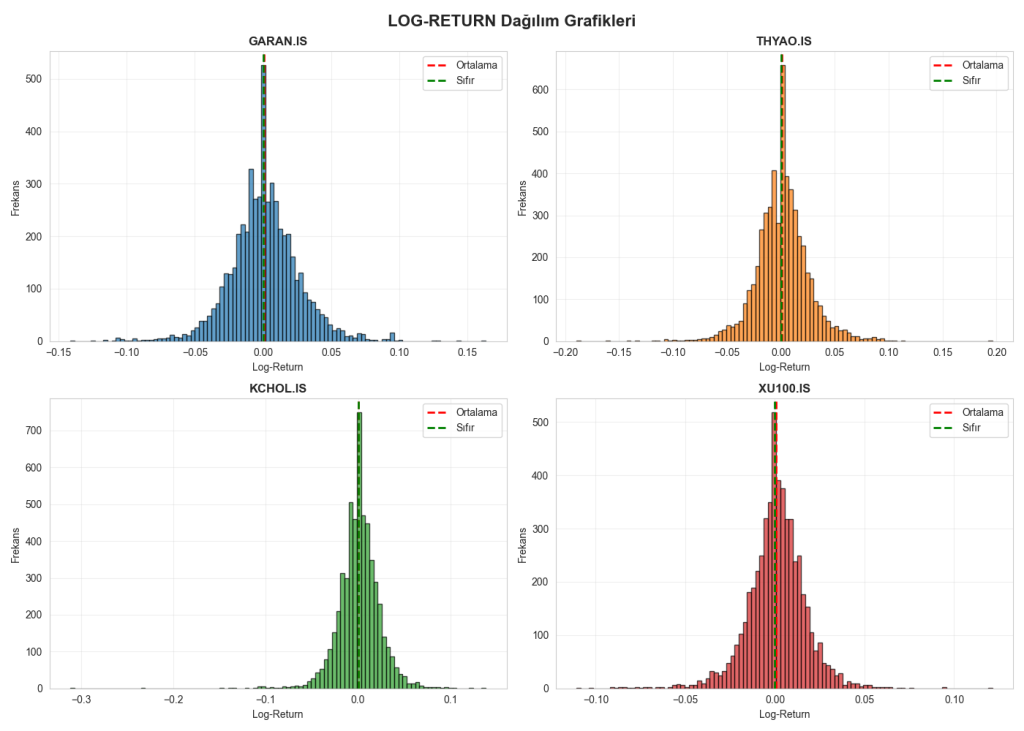 Shapiro-Wilk ve Jarque-Bera testleri, tüm serilerin normal dağılım göstermediğini ortaya koymuştur (p < 0,001). Bu sonuç, finansal getiri serilerinin leptokurtik (kalın kuyruklu) yapısıyla tutarlıdır ve Merkezi Limit Teoremi’nin geçerliliği nedeniyle büyük örneklemlerde regresyon analizinin güvenilirliğini ciddi ölçüde etkilememektedir.