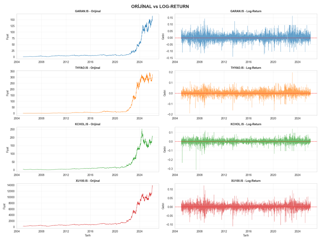 Finansal zaman serisi regresyon analizlerinde fiyat serileri yerine logaritmik getiri serileri tercih edilmektedir. Logaritmik getiri, rt = ln(Pt / Pt-1) formülü ile hesaplanmış olup, bu dönüşüm serilerin durağanlaşmasını sağlamaktadır. İlk gözlemin fark alma işlemi sonucu kaybolmasıyla nihai örneklem büyüklüğü 5.410 olarak belirlenmiştir.