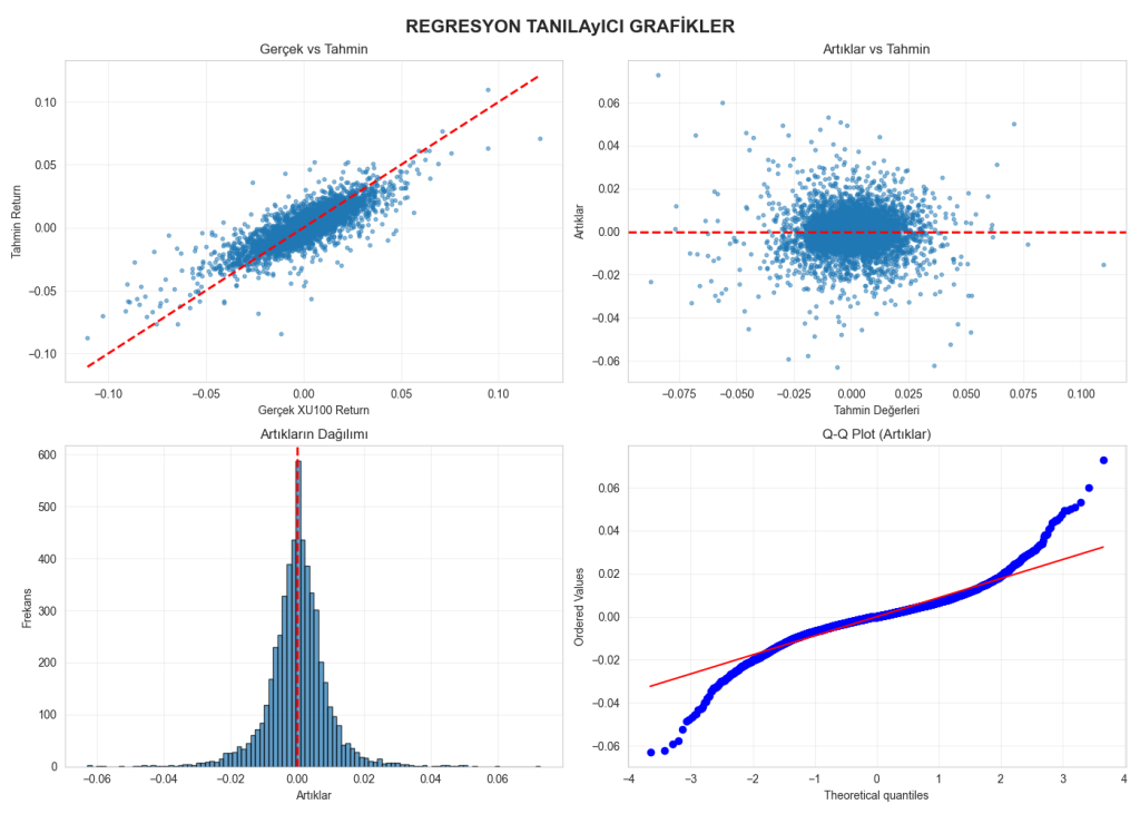 GARAN en büyük katsayıya (β = 0,267) sahip olup, endeks üzerindeki en güçlü açıklayıcı değişkendir. Bunu KCHOL (β = 0,220) ve THYAO (β = 0,181) takip etmektedir. Sabit terim istatistiksel olarak anlamsızdır (p = 0,207), bu da modelin sıfır getiri düzeyinde sistematik bir sapma içermediğini göstermektedir.